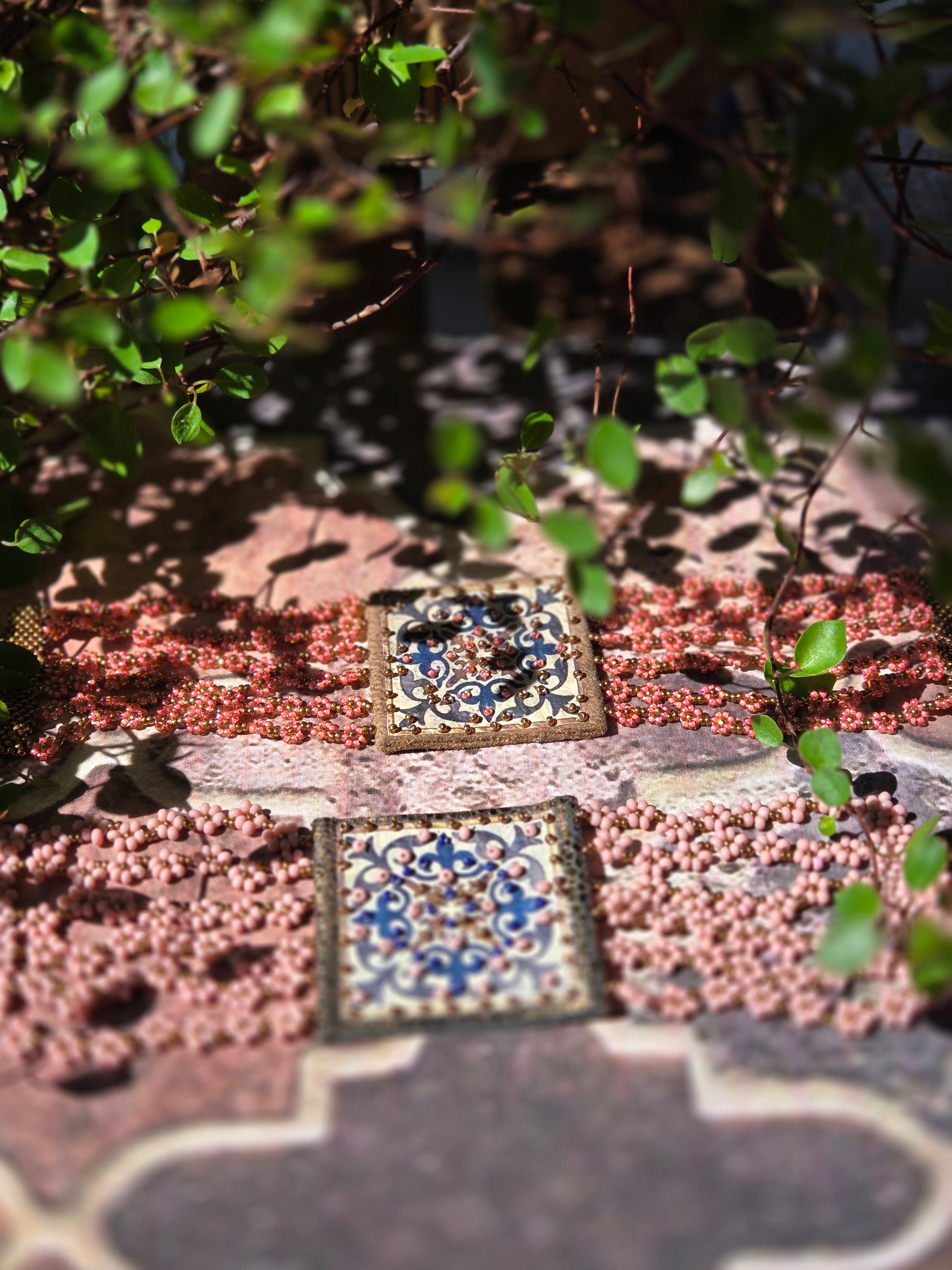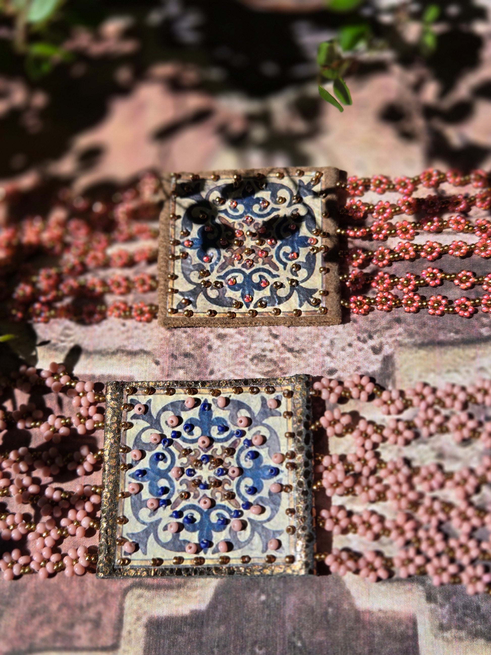 An exceptional bracelet in golden red leather, decorated with delicate arabesques and flower-shaped miyuki beads. Each piece is carefully handcrafted, combining the finesse of the design with the quality of the materials.