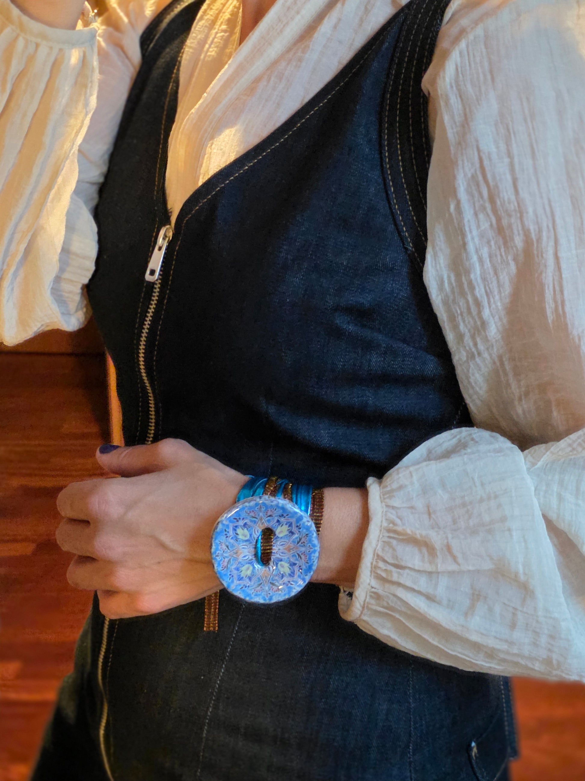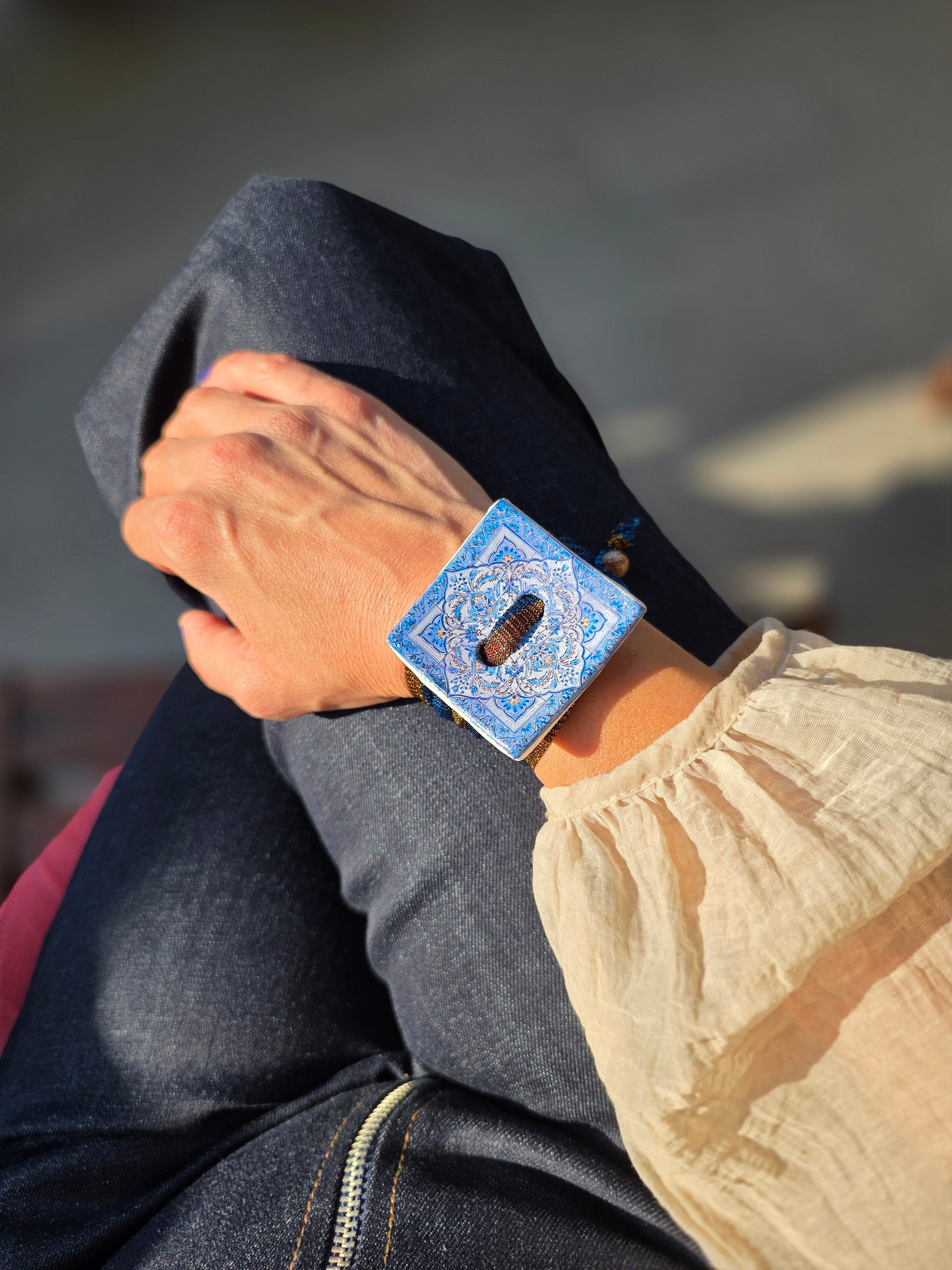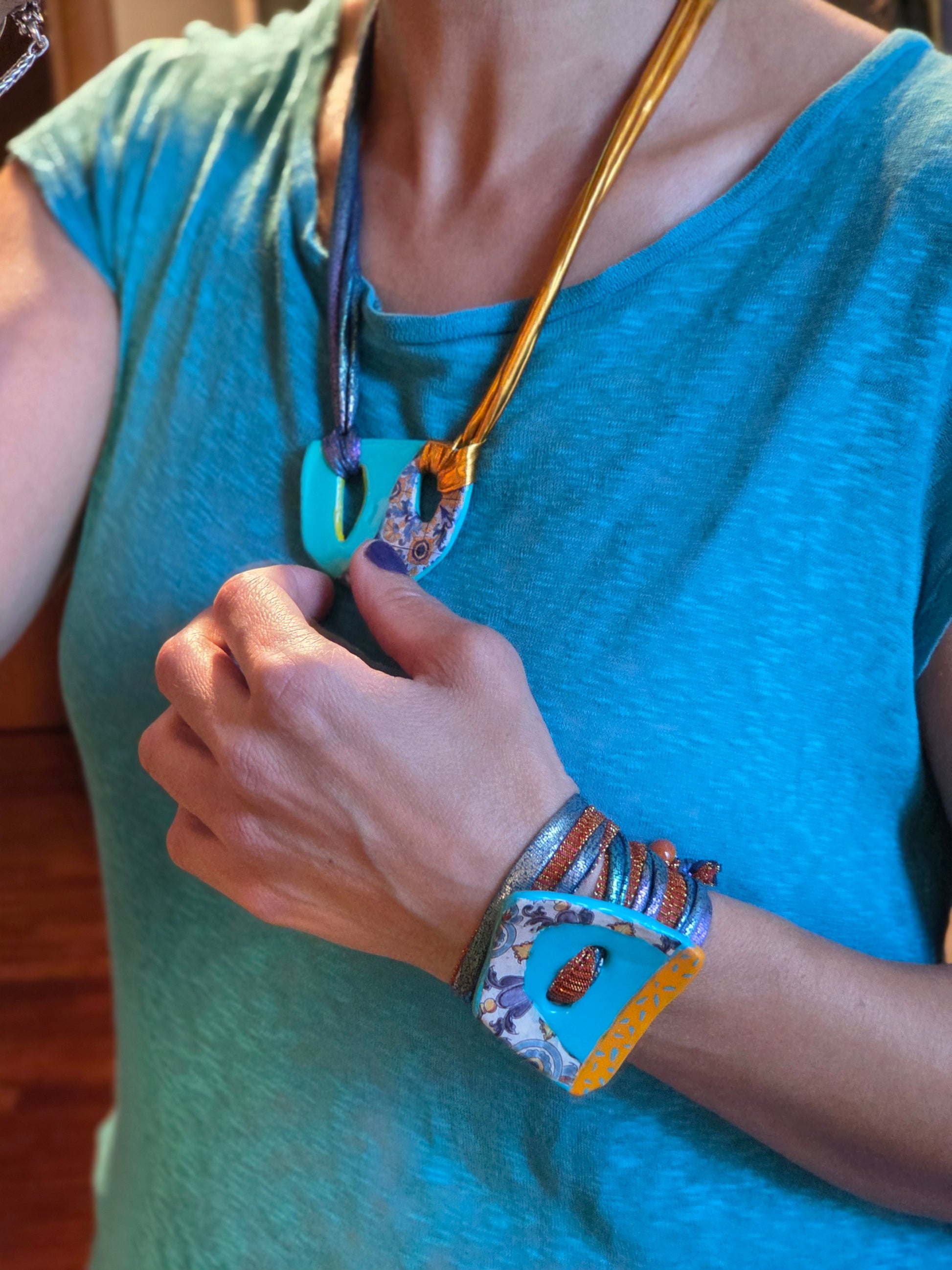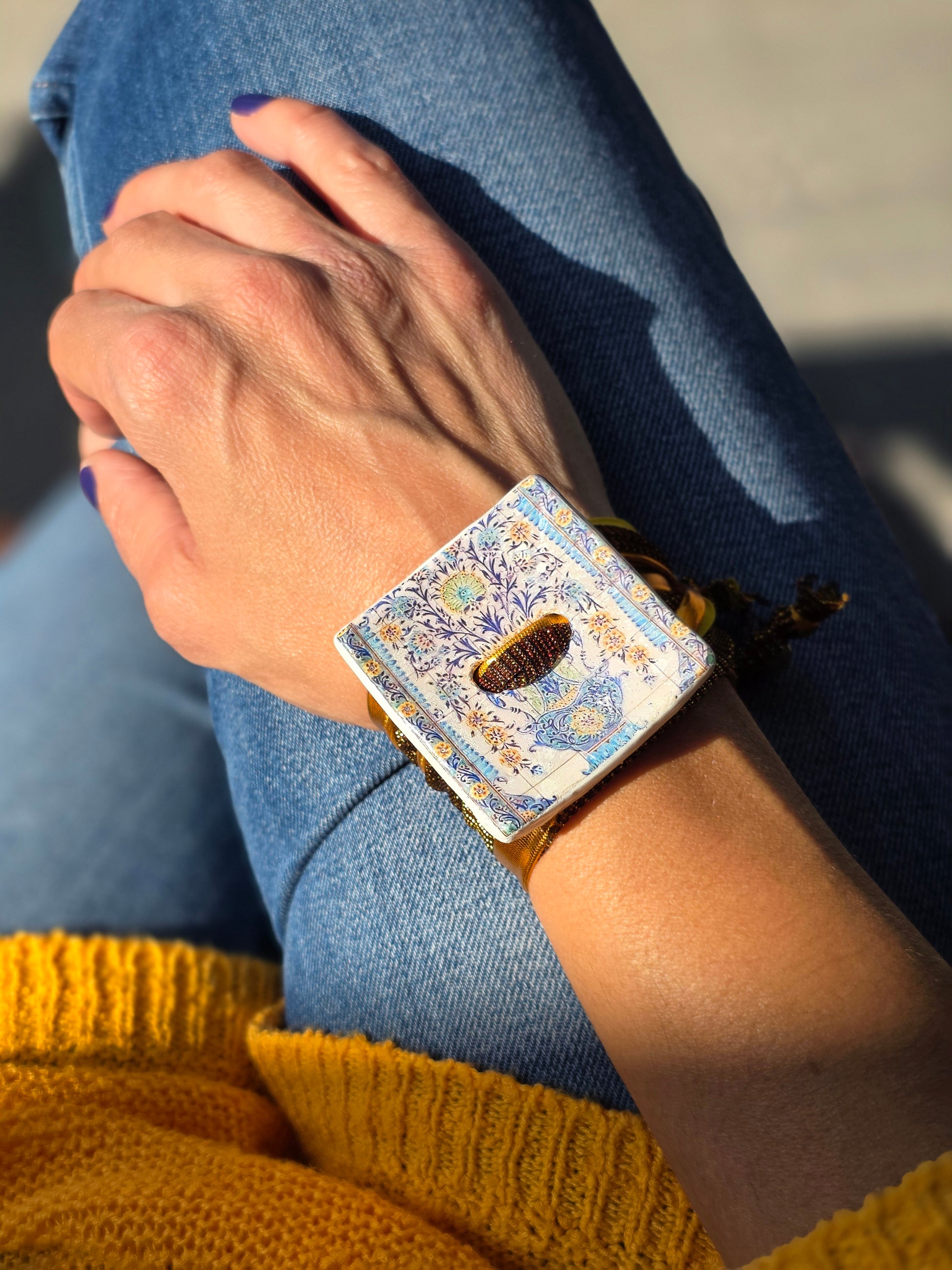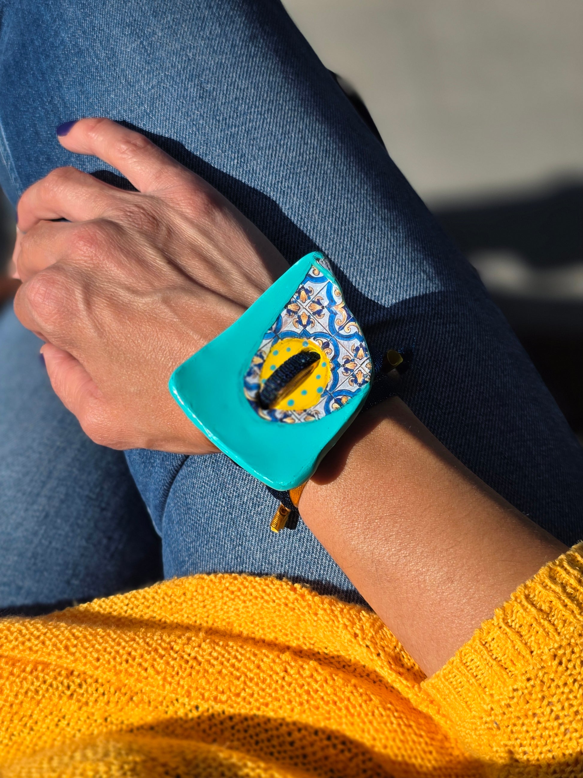 Aggiungi un tocco di autenticità al tuo stile con questo bracelet Zellidj algerino, interamente fatto a mano. Il suo design artigianale permette di trasformarlo facilmente in una collana o in una cintura, offrendo una versatilità unica per ogni occasione. Un gioiello moderno che celebra il ricco patrimonio tradizionale, consentendoti di creare look varie ed eleganti.