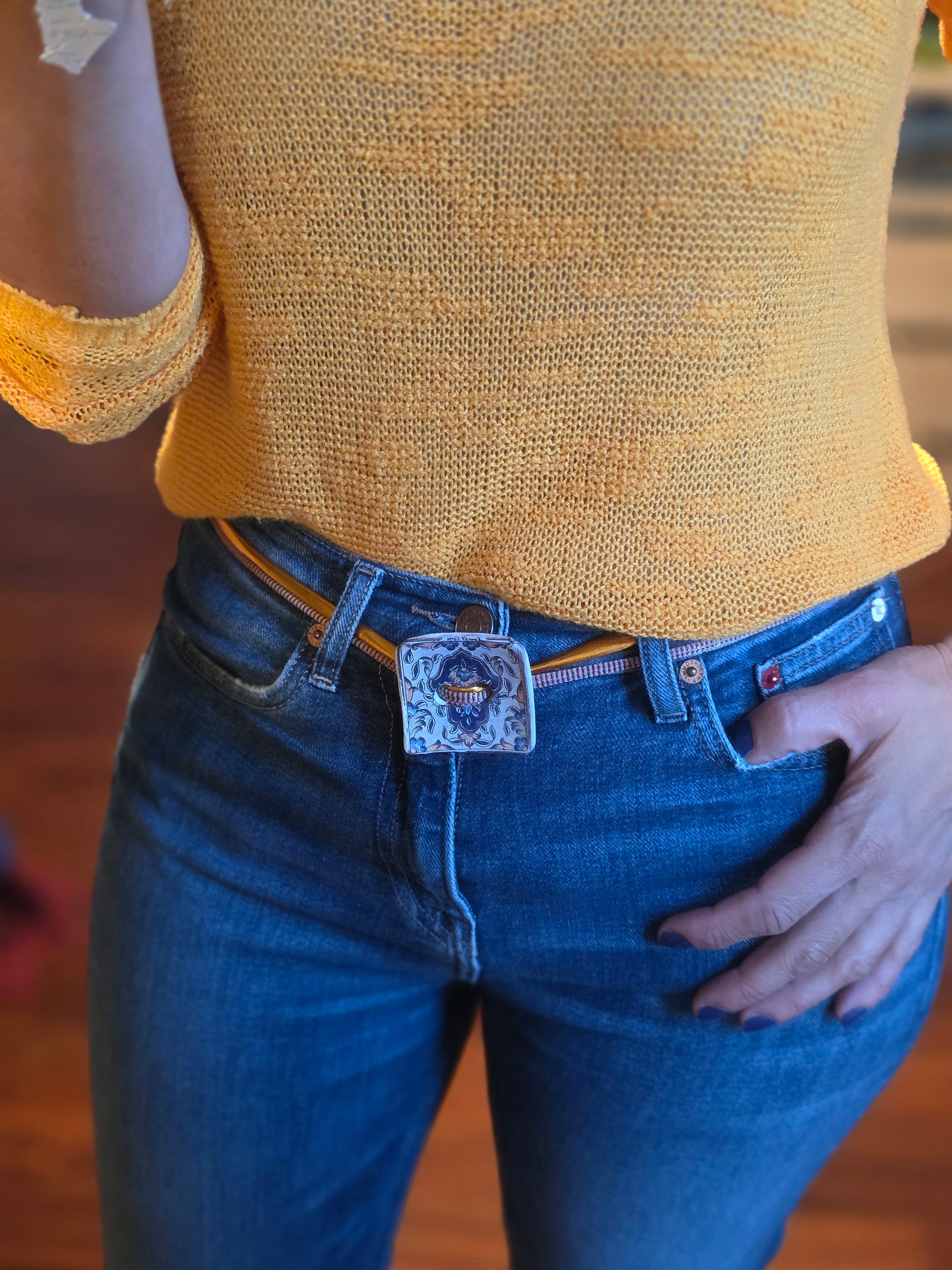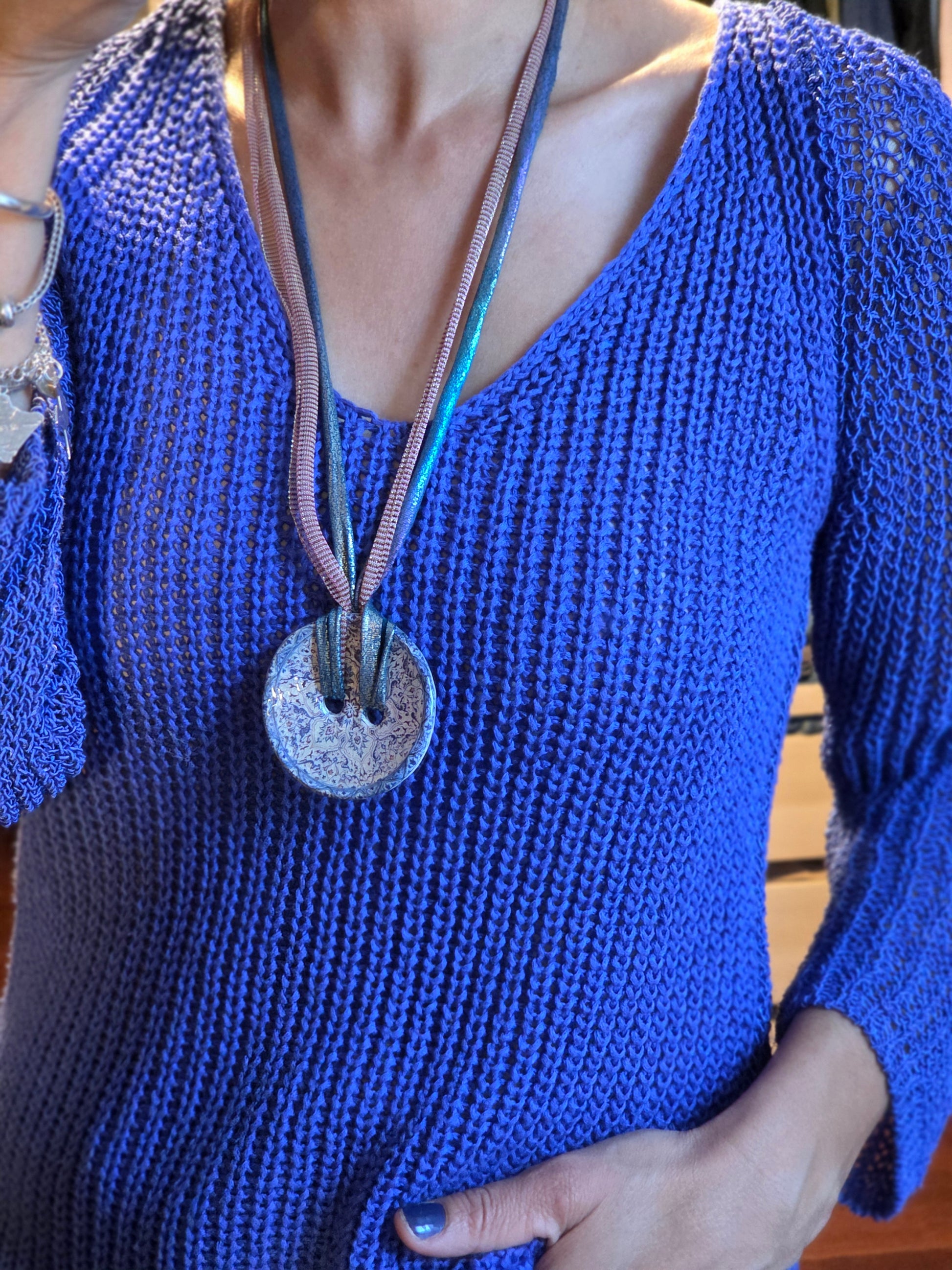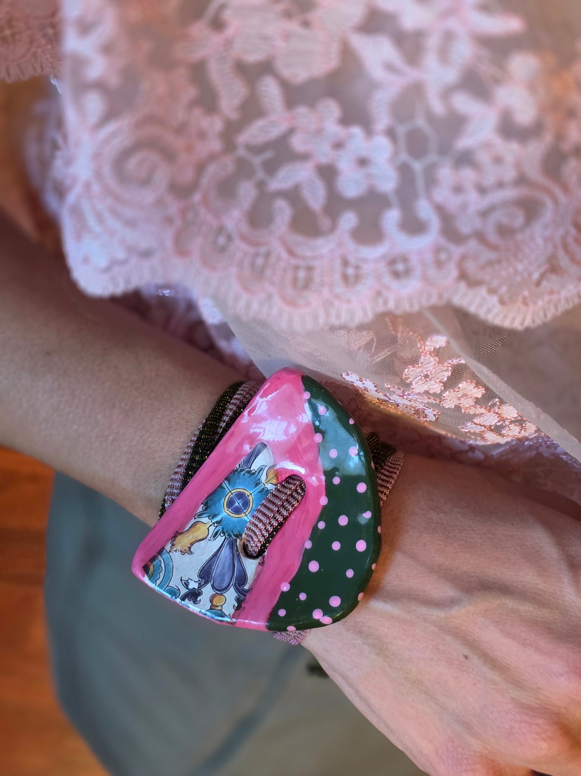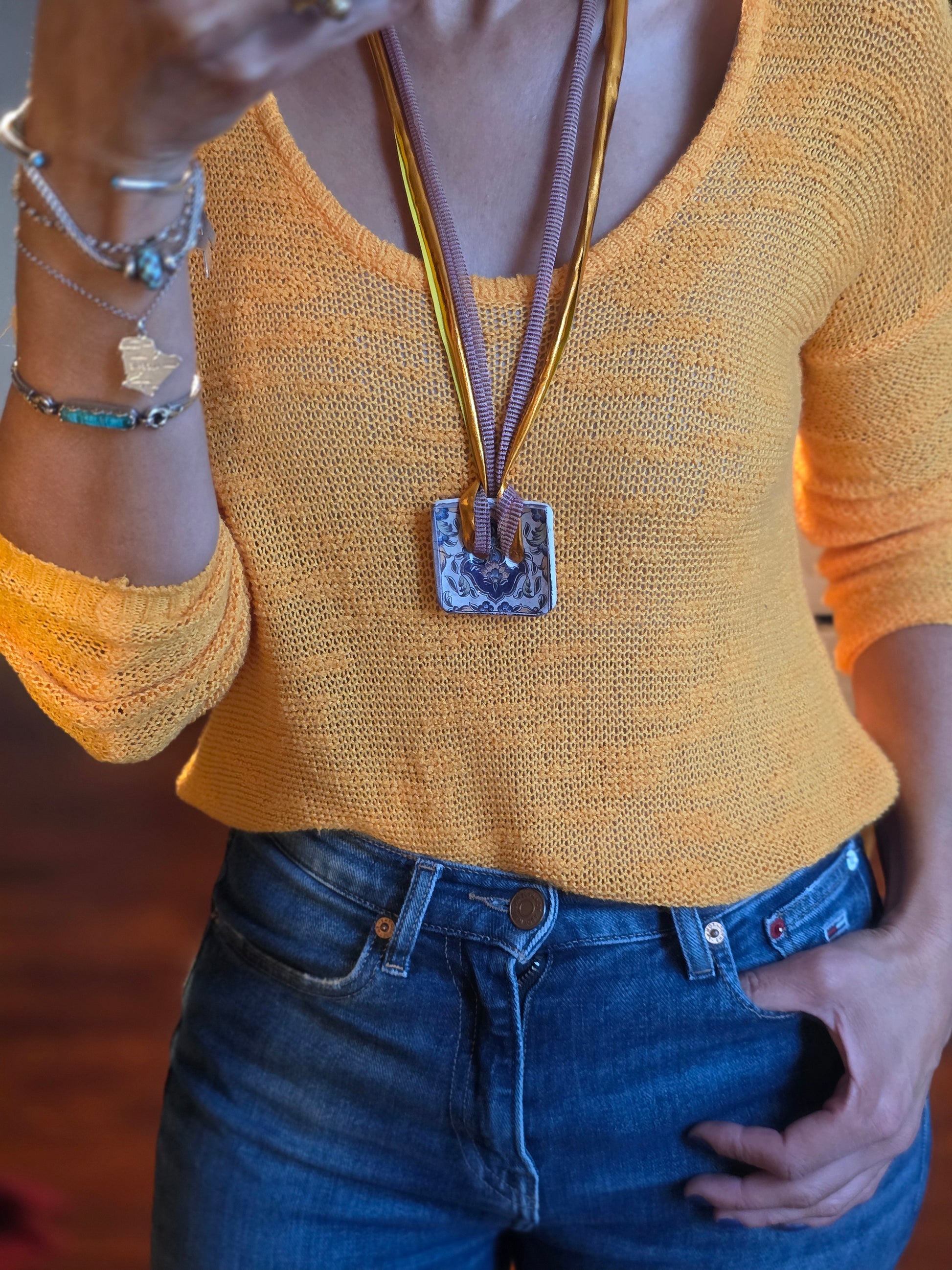 Aggiungi un tocco di autenticità al tuo stile con questo bracelet Zellidj algerino, interamente fatto a mano. Il suo design artigianale permette di trasformarlo facilmente in una collana o in una cintura, offrendo una versatilità unica per ogni occasione. Un gioiello moderno che celebra il ricco patrimonio tradizionale, consentendoti di creare look varie ed eleganti.
